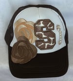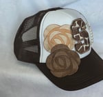 Brown Trucker hat with brown and off-white roses and giraffe print letter with pearl pin.