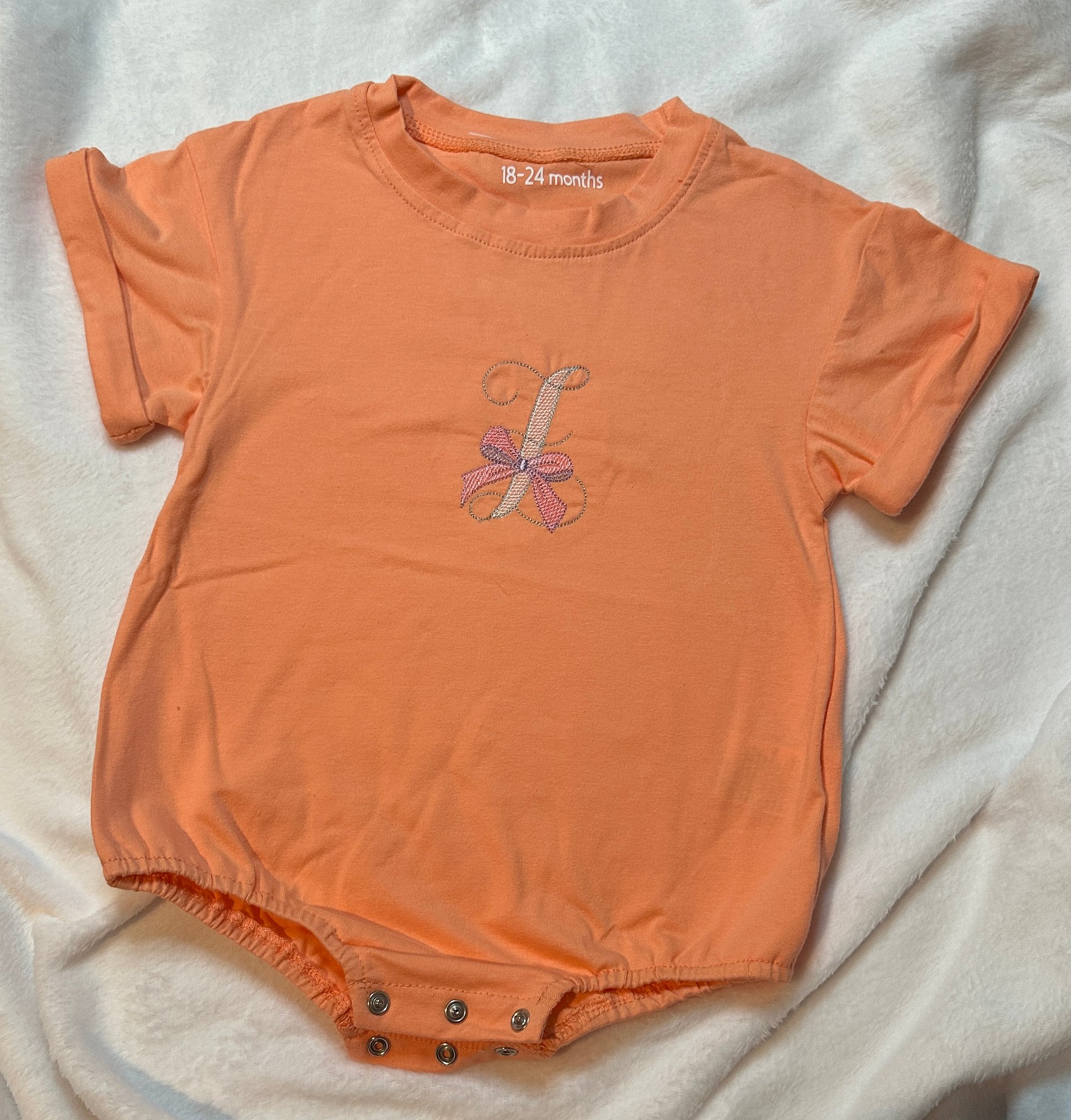 Coral Baby Romper with Pink Bow and White and Gray “Z”