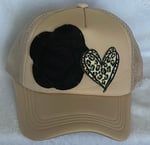 Tan Trucker hat with leopard heart/Tan Trucker hat with leopard heart and large flower/Tan Trucker Hat with leopard heart, two small flowers, and two stars.