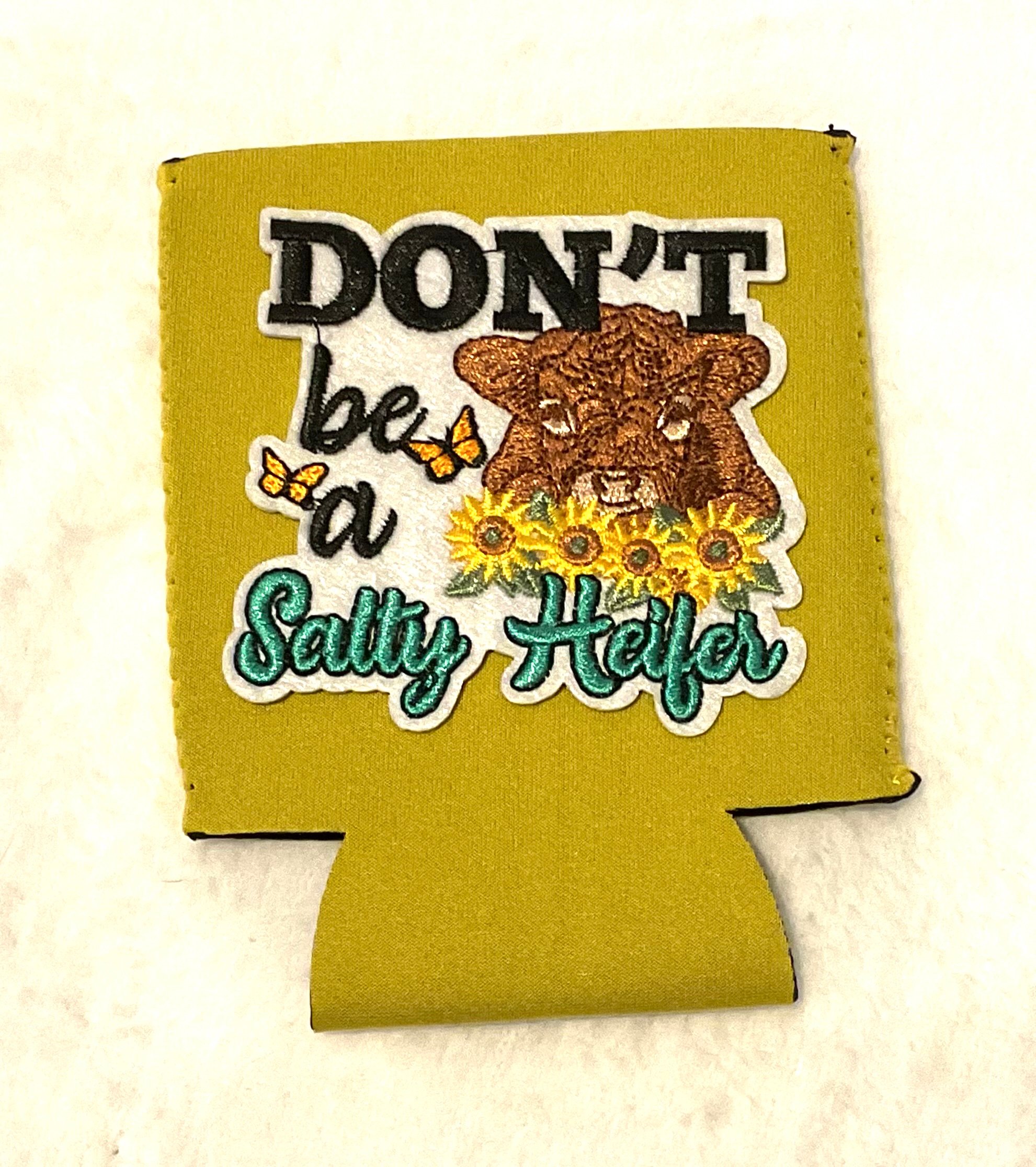 Yellow Koozie with Don’t Be a Salty Heifer patch
